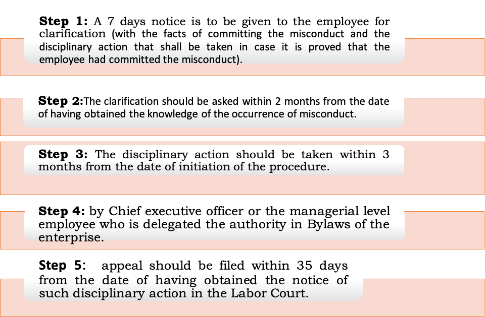 Misconducts | a. To refuse to receive any letter or notice given by the employer or sentencing authority b. To take part in an illegal strike or force others to do so or make delay or slow in work collectively c. To cause loss or damage to the enterprise by decreasing the production or service recklessly or negligently d. To make attempt to take benefits by submitting false documents, e. To not use the equipment provided by the employer if he or she is a labour responsible for using such equipment,