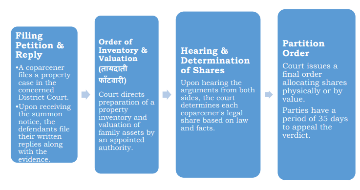 When conflict arises, or consent cannot be received during the partition of the parental property, the coparceners have the option to seek judicial help for an equal, fair, and unbiased partition of the property among themselves. The process is as follows: